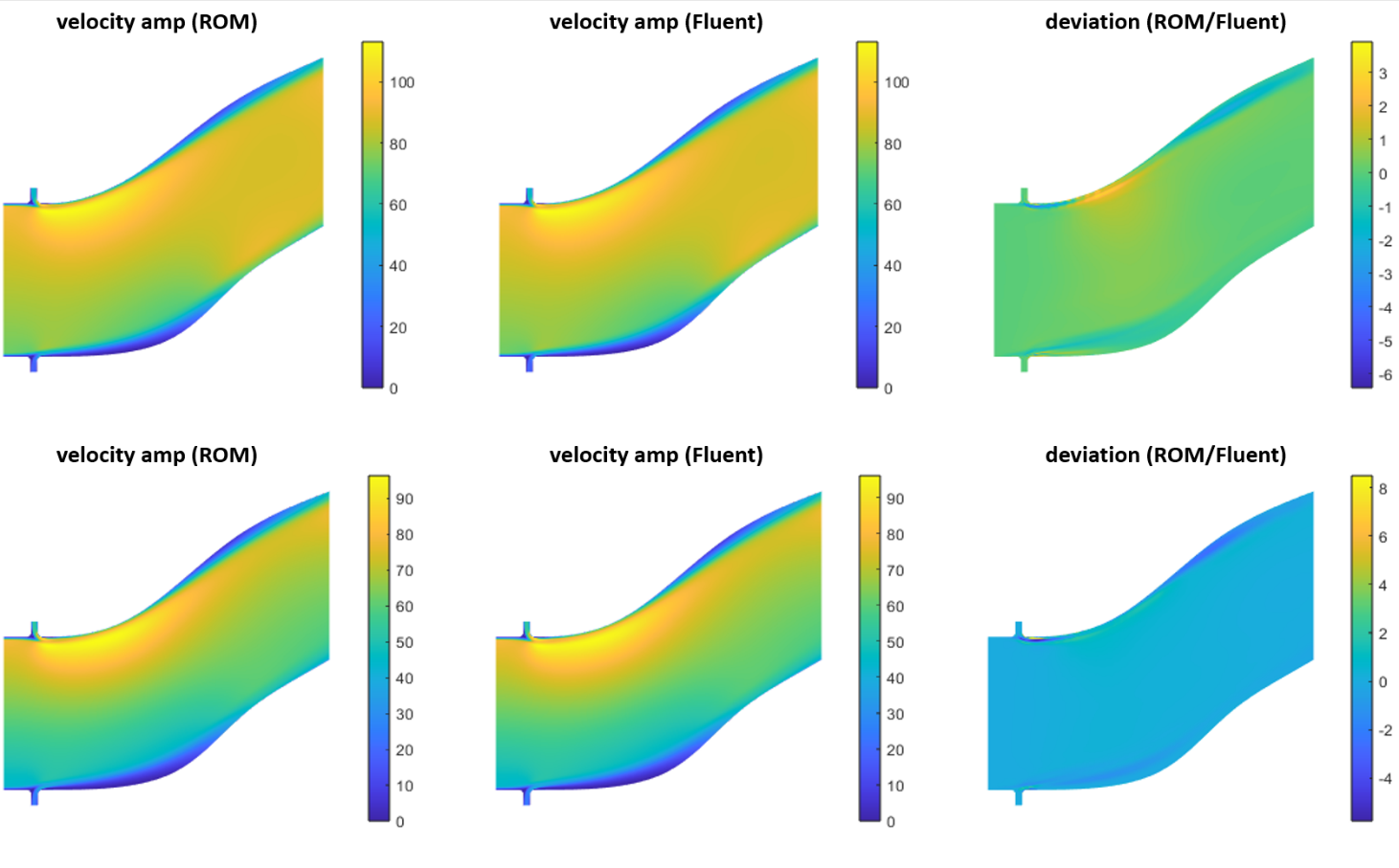 Die Ergebnisse zweier repräsentativer Testfälle sind in Abb. 5 dargestellt. Die beiden Grafiken auf der linken Seite zeigen die Ergebnisse des reduzierten Modells, während die beiden Grafiken in der mittleren Spalte die Ergebnisse des kommerziellen CFD-Codes ANSYS Fluent zeigen. Auf der rechten Seite sind Unterschiede zwischen den beiden Ergebnissen dargestellt.