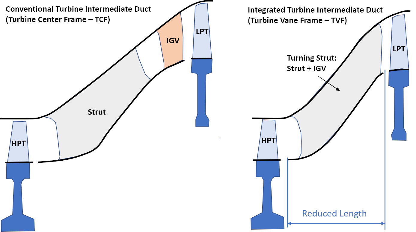 Die Bestrebungen der letzten Jahre zielen vermehrt darauf ab, die ohnehin vorhandenen Stützschaufeln für die Konditionierung der Luftströme zu nutzen. In sogenannten Turbine-Vane-Frames (TVF) wird – im Gegensatz zu den Turbine Center Frames (TCF) - die Strömung in Umfangsrichtung umgelenkt, um optimale Eintrittsbedingungen für die LPT bereitzustellen. Dadurch können die umlenkenden Statorschaufeln (IGV) der LPT wegfallen, was zu einer deutlichen Reduktion von Länge und Gewicht des Triebwerks führt (Abb. 2).